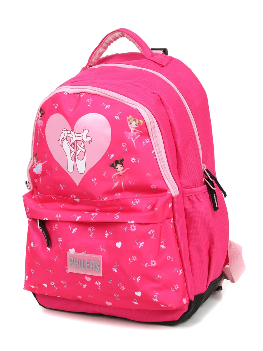 Le compartiment du sac à dos fille Philéas Fashion Ballerine loge les cahiers et les classeurs de formats A4 et 24 x 32 cm, ainsi que les manuels. Il cache une poche plate zippée, pratique pour mettre à part de petits éléments susceptibles de se perdre au fond du sac. La grande poche frontale permet de saisir rapidement la cahier de correspondance, l’agenda et la trousse. La poche avant plus petite loge par exemple le trousseau de clefs de la maison, le porte-monnaie et l’étui à lunettes. Enfin, une bouteille et un parapluie peuvent être glissés dans les deux poches latérales. Tous ces espaces de rangement sont dotés d’une doublure intérieure.
