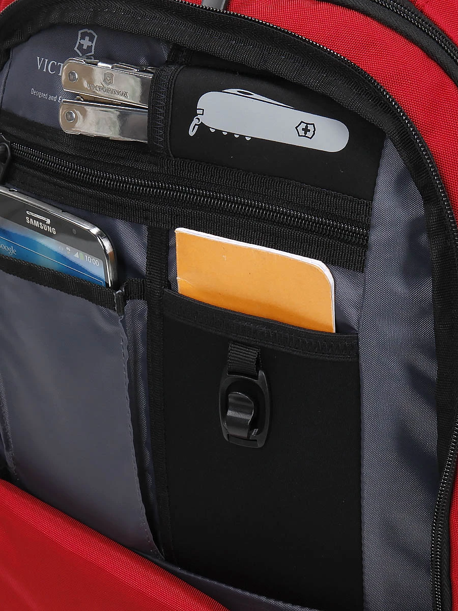 Le sac casual Victorinox VX Sport Evo Daypack offre 2 compartiments spacieux parfaits pour un peu de linge, des documents de travail, des affaires de cours… Pour un ordinateur 16 pouces et une tablette, son compartiment arrière renferme 2 poches spécifiques. Pour sérier efficacement petits effets personnels et accessoires multimédia, sa grande poche frontale dispose de nombreuses petites poches. On y trouve également une poche pour couteau suisse et une attache porte clés. Sur les côtés, 2 poches porte bouteille viennent compléter le tout.